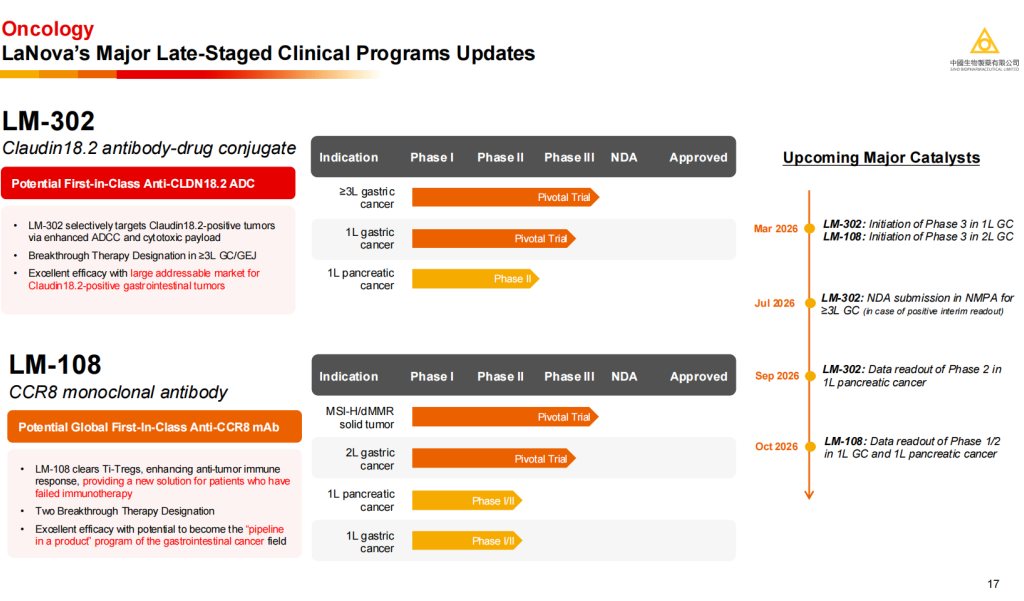 ·LM-302:一款具备全球同类首创(FIC)潜力的CLDN18.2 ADC,已获用于治疗晚期或转移性胃及胃食管交界部腺癌的突破性疗法认定。LM-302计划于2026年3月启动一线胃癌的Ⅲ期临床,并有望于2026年中期向国家药品监督管理局(NMPA)提交用于三线及以上胃癌适应症的上市申请,一线治疗胰腺癌的最新研究数据预计在今年读出。