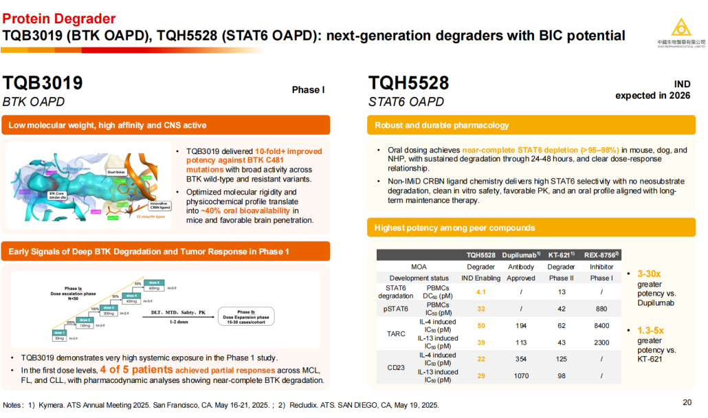 ·TQB3019:一款口服、靶向BTK的PROTAC药物,在动物模型中口服生物利用度高达40%。在Ⅰ期临床的首个给药剂量组中,5例患者中有4例在套细胞淋巴瘤(MCL)、滤泡性淋巴瘤(FL)和慢性淋巴细胞白血病(CLL)中获得部分缓解,药效学分析显示BTK蛋白被近乎完全降解。