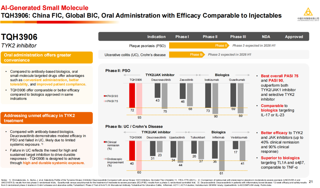 ·TQH3906:新一代口服TYK2抑制剂,在斑块型银屑病的Ⅱ期研究中,PASI-75和PASI-90应答率分别高达93%和72%,媲美生物制剂;在溃疡性结肠炎的Ⅰb期数据中,展现出40%的临床缓解率,超同类药物。公司计划与2026年上半年启动与现有TYK2抑制剂“头对头”治疗银屑病的Ⅲ期研究,用于溃疡性结肠炎的Ⅱ期研究也将同期开展。