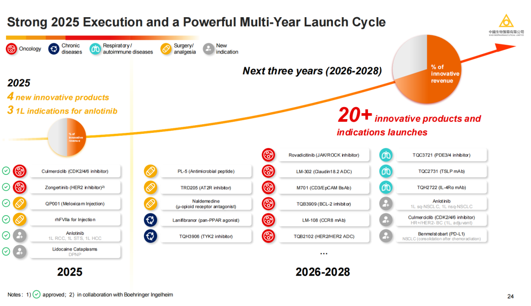 依托强大的管线组合和技术平台,中国生物制药正进入由创新驱动的全新发展阶段。2026年至2028年间,预计将有超过20个创新产品/新适应症获批上市。随着赫吉亚和礼新医药的深度整合,以及内部研发平台的持续产出,中国生物制药有望在创新质量、全球化布局及长期增长动能方面实现全面跃升,向成为全球领先的创新驱动型制药企业的目标稳步迈进。