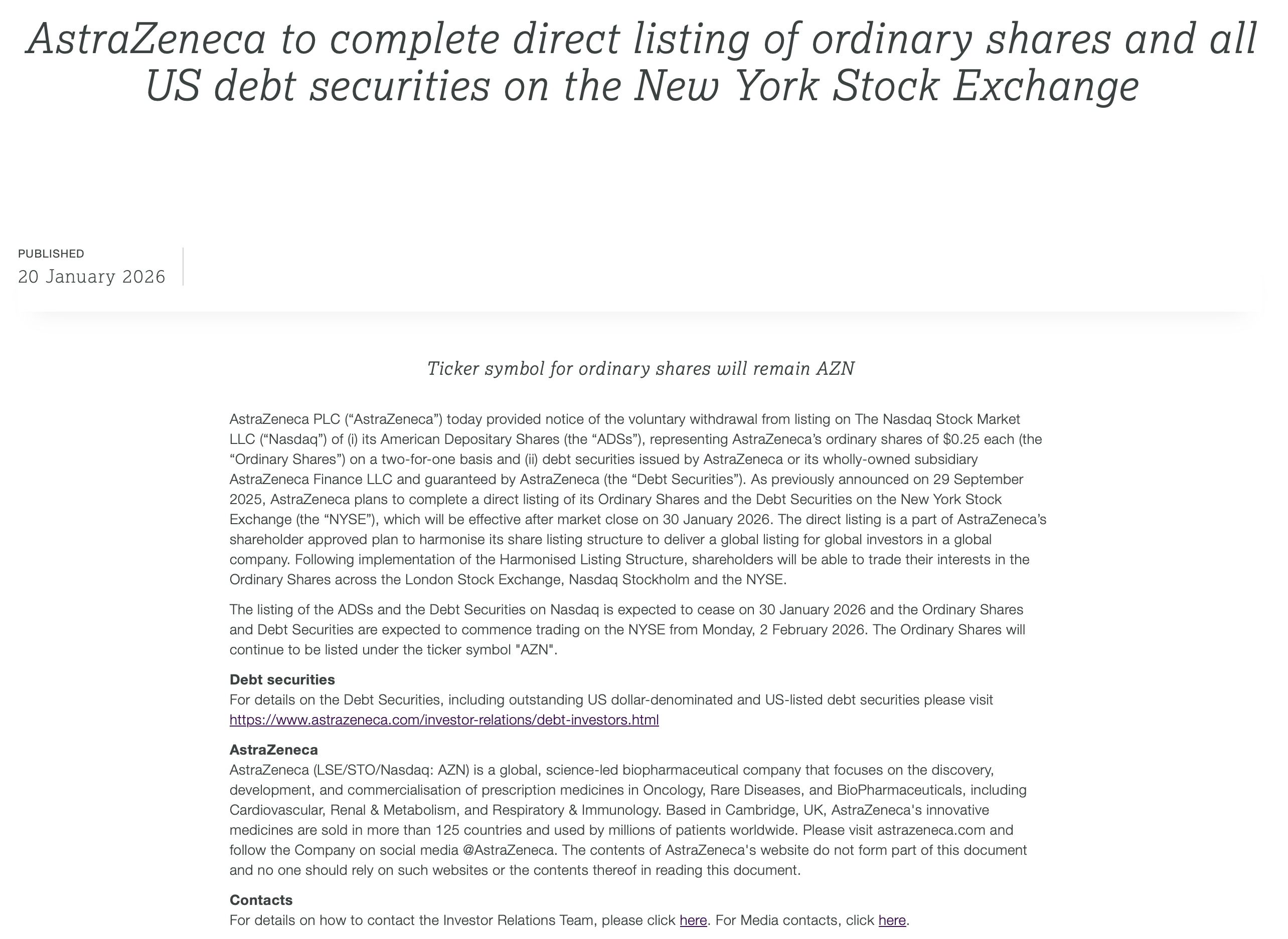 与此同时,阿斯利康的普通股及相关债务证券将于2026年2月2日在纽约证券交易所正式挂牌交易,股票代码仍沿用“AZN”。 这一调整并非临时决策,在2025年9月,阿斯利康便已对外披露相关计划,核心目标是统一全球上市结构。