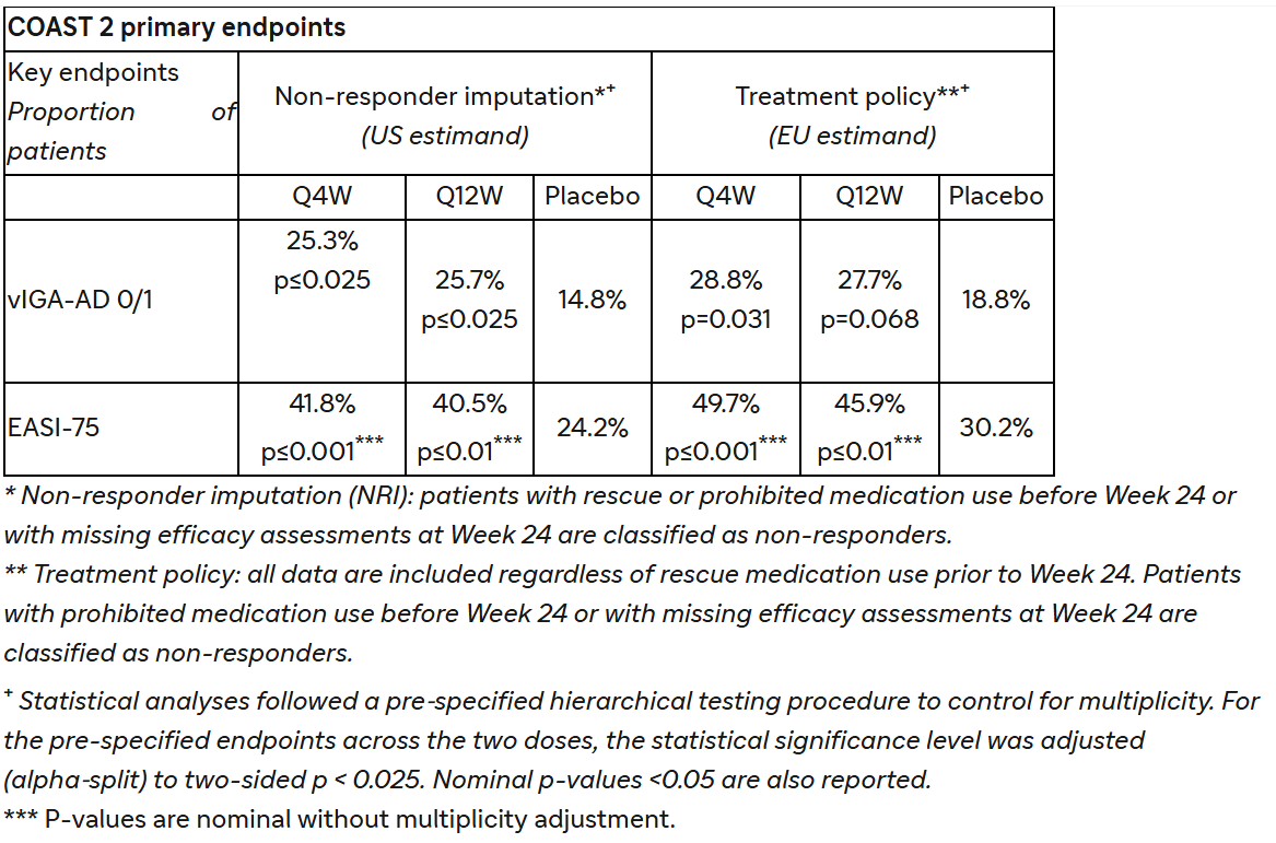 In the COAST 2 phase 3 study, amlitelimab demonstrated statistically significant efficacy on vIGA-AD 0/1, the primary endpoint as assessed for the US and US reference countries, and confirmed COAST 1 potential for Q12W dosing from the start; amlitelimab did not achieve statistical significance for the co-primary endpoints as assessed for the EU and EU reference countries