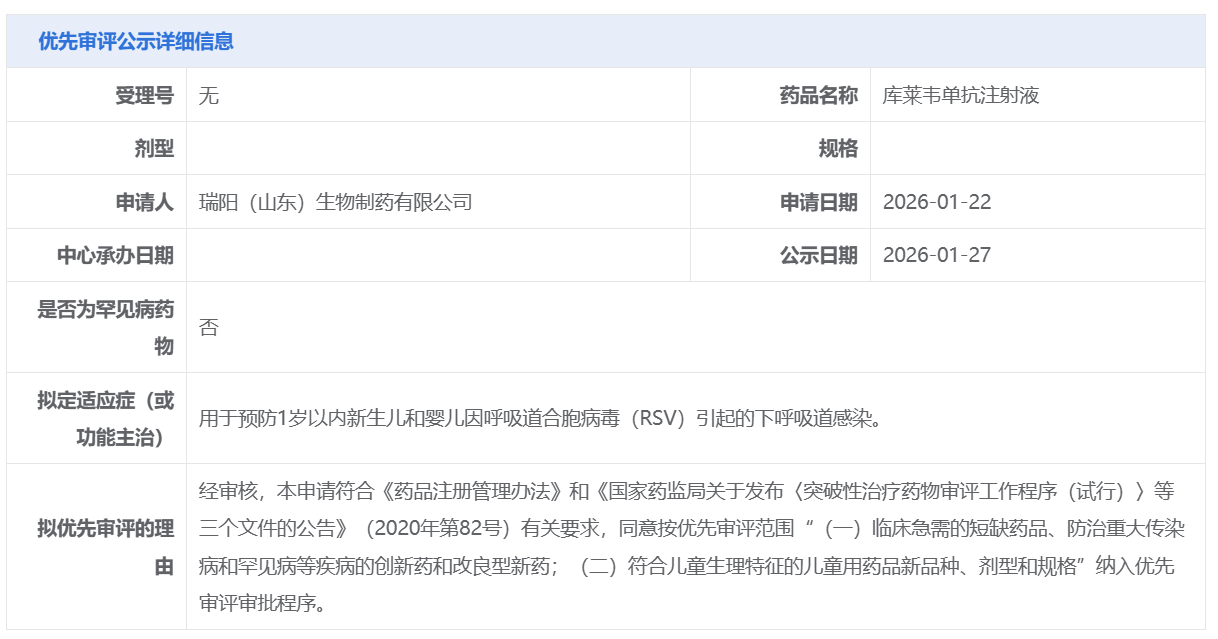 瑞阳(山东)生物的库莱韦单抗注射液获CDE拟纳入优先审评