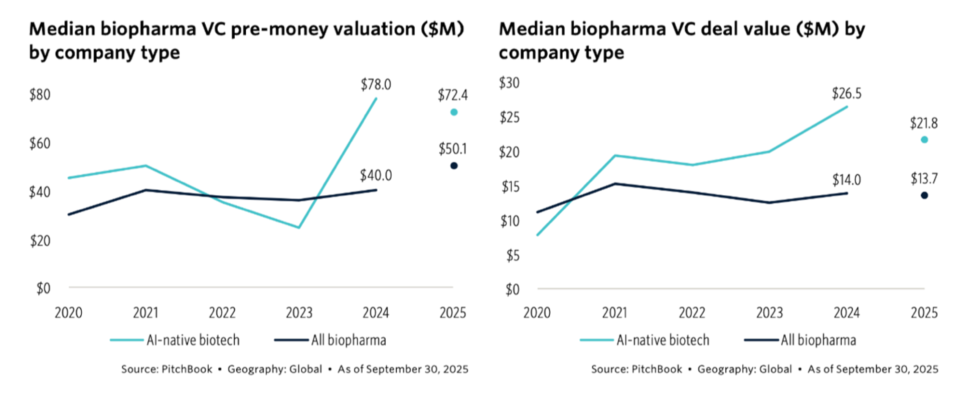过去5年,全球AI生物科技公司风险投资交易金额显著高于业内其他公司。据数据提供商PitchBook发布的一份报告,2024年,从创立之初就采用AI技术的生物科技公司风险投资交易金额中位数为2650万美元,几乎是非AI同行(1400万美元)的两倍。2025年前三个季度,这两个数据分别为2180万美元和1370万美元。2024年投前平均估值分别为7800万美元和4000万美元,差异最为显著。(见下图)