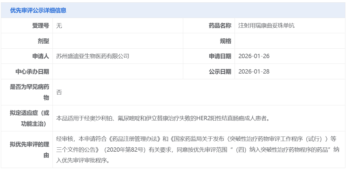 盛迪亚生物的注射用瑞康曲妥珠单抗获CDE拟纳入优先审评