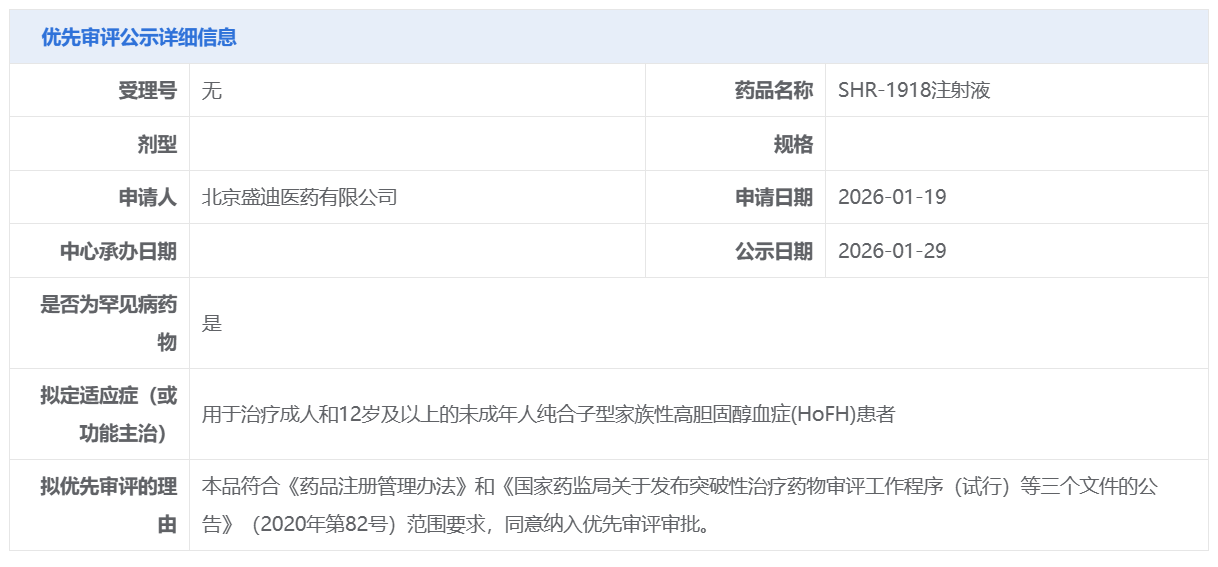 盛迪医药的SHR-1918注射液获CDE拟纳入优先审评