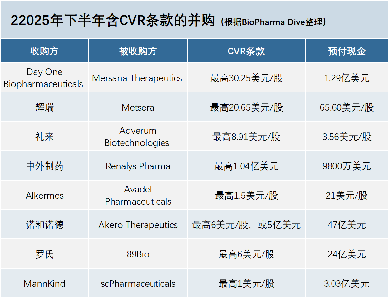 据BioPharma Dive统计,2025年下半年,约有三分之一的大额并购交易采用了CVR模式。