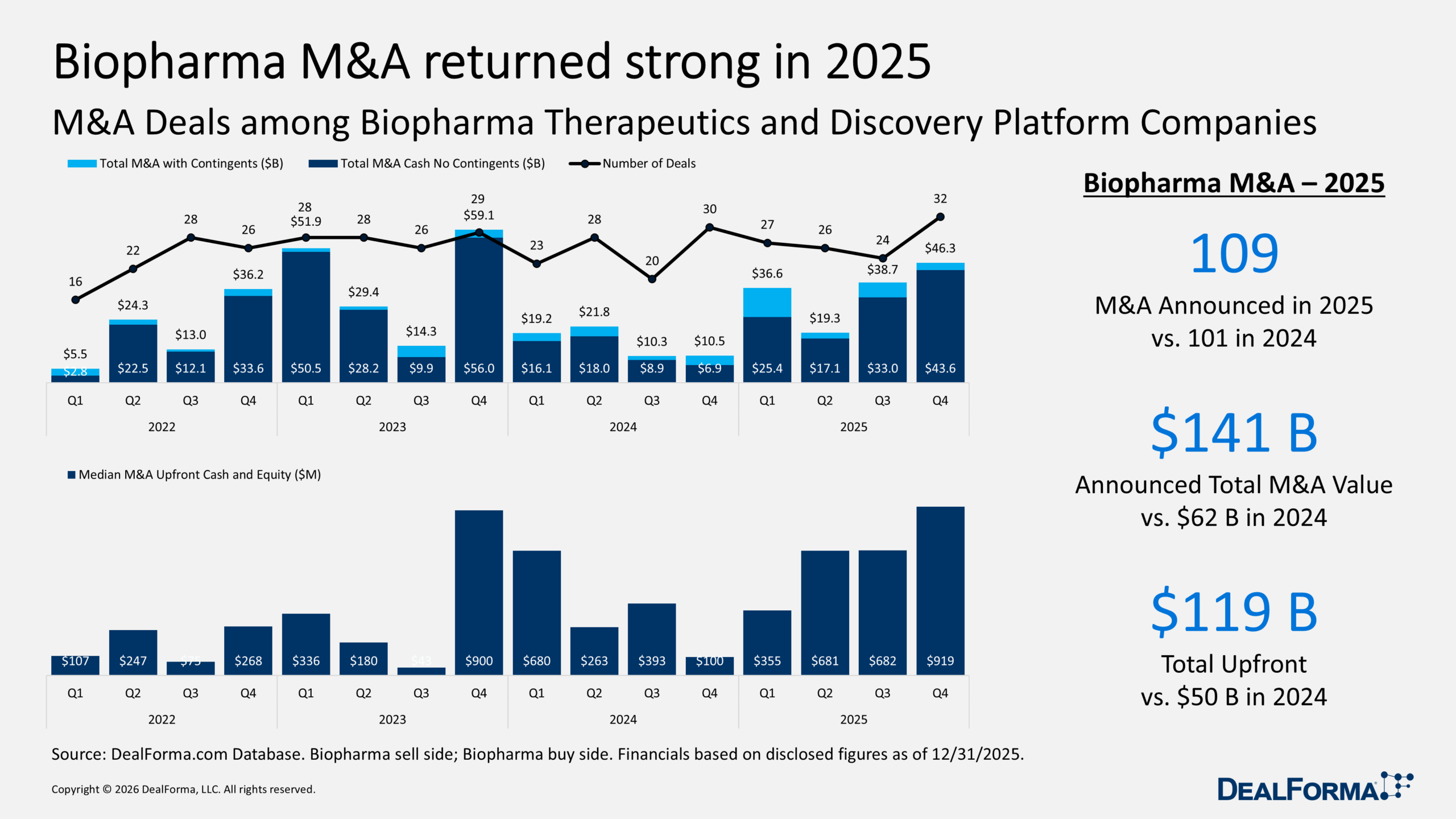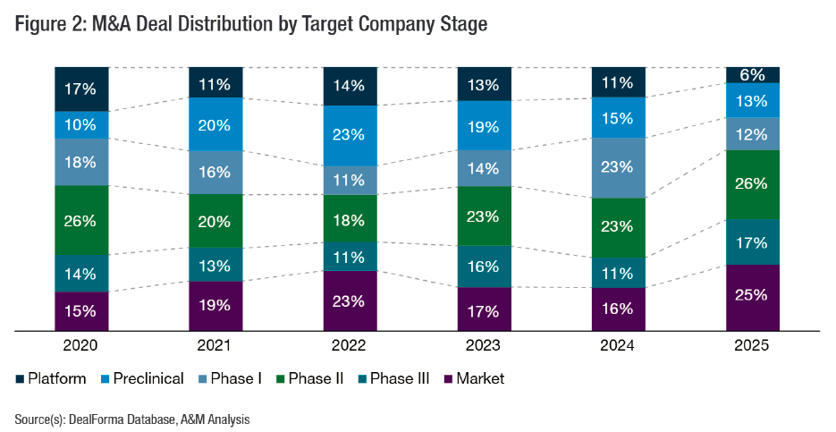 值得一提的是,通过收购已有商业化产品的企业来补充管线的案例持续增多。DealForma统计显示,2025年并购拥有商业化产品的公司占比达25%,2024年仅16%。