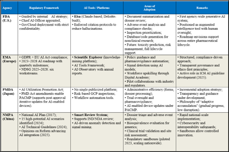 中国NMPA非常重视AI在药物监管中的应用,发布了“药物管理典型AI应用场景清单”,详细描述了如何将AI嵌入监管实践。例如,NMPA使用的“智能审核系统”集成了机器学习算法,用于优先处理监管提交、检测档案中的异常以及自动化常规合规检查。这些措施不仅减轻了人工负担,还加快了审批时间。另外,药品审评中心(CDE)发文通知自2026年3月起,化学药品、化学原料药和生物制品的药物临床试验申请、药品上市许可注册申请、补充申请、境外生产药品再注册申请和仿制药一致性评价申请等,可按照eCTD方式申报。这一模块化、结构化、电子化申报资料递交方式,标志着CDE在收集高质量数据上又迈出一步,也为后续开展AI训练与学习打下基础,进一步推动AI在审评审批中的应用。