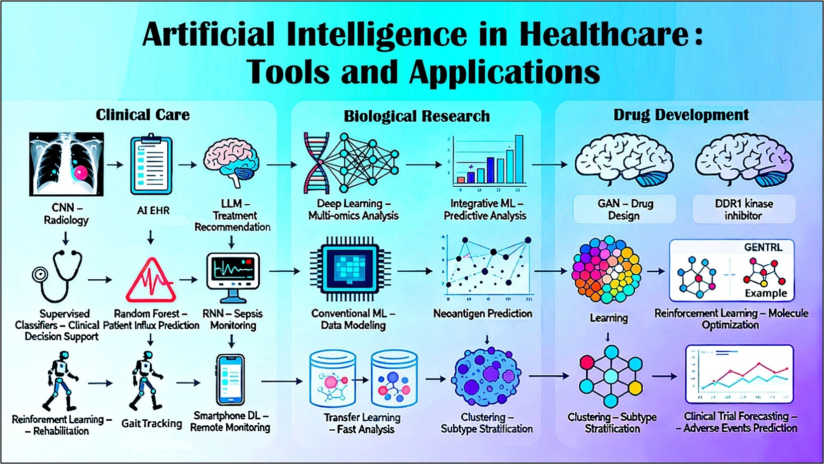 有的,而且不少已经进入日常使用。比如在影像科,卷积神经网络(CNN)能比资深放射科医生更快、更准地识别肺部小结节;在急诊,随机森林算法可以预测未来几小时的患者流量,帮助医院动态调配人力和床位;还有大型语言模型(LLM),能实时分析电子病历,一旦发现患者有脓毒症早期迹象,立刻给出评估和用药建议。甚至在康复领域,强化学习正在调控外骨骼机器人,让中风患者恢复得更快。这些都不是未来幻想,而是今天很多医院已经在试用或部署的技术。