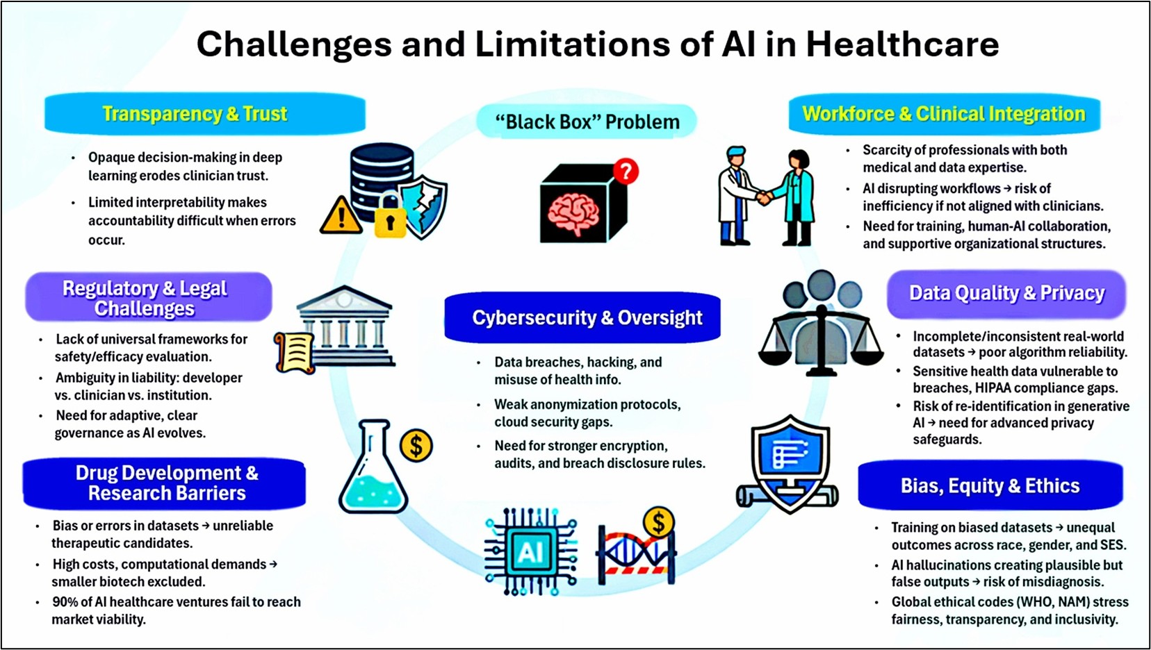 我的观点很明确:AI是“增强智能”(Augmented Intelligence),不是“替代智能”。它擅长处理海量数据、发现隐藏模式,但医学和制药的核心始终是人。诊断需要结合患者的社会心理背景,治疗要考虑伦理、价值观和生活质量,这些都是AI算法无法完全捕捉的。更重要的是,目前很多AI模型还是“黑箱”作业,决策过程并不透明。如果出了问题,谁来负责——是医生、医院、AI供应商、或其它机构?所以,AI必须作为医生的“认知助手”,在人类监督下使用,而不是独立做临床决定。