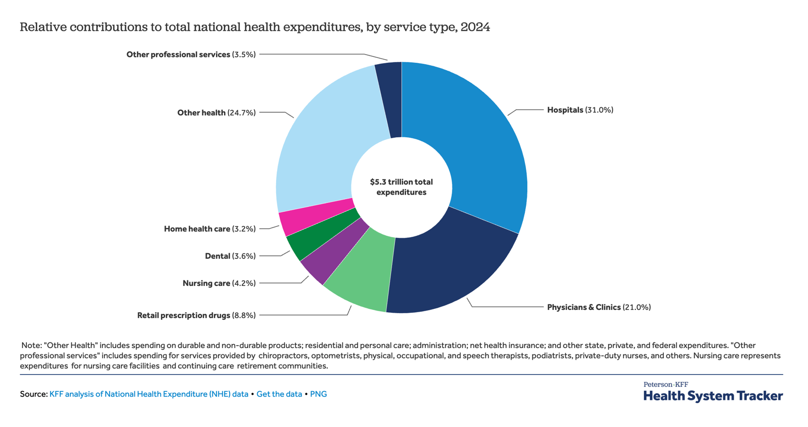 以2024年的数据为例,医院支出占整体医疗保健支出的近三分之一(31.0%),医生/诊所支出占总支出的21.0%,而零售处方药支出仅占8.8%。(见下图)