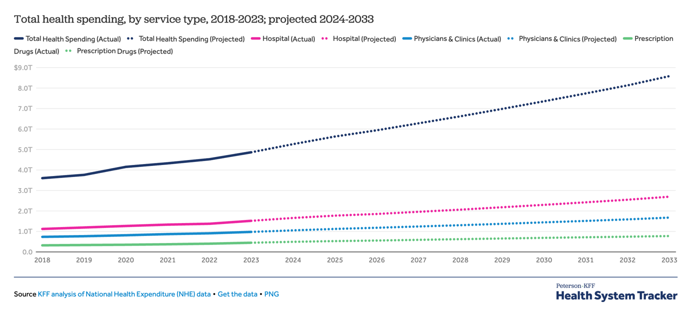 CMS预计2025年美国医疗保健支出总额将达到约5.6万亿美元,其中医院支出占比最大(约1.8万亿美元)。到2033年,医疗保健总支出预计将达到约8.6万亿美元,医院支出将达到约2.7万亿美元,医生/诊所的支出费用将增至1.7万亿美元,处方药支出预计为7760亿美元。
