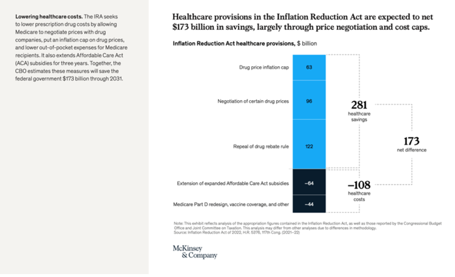 据麦肯锡报告,到2031年,IRA预计可为美国政府减少2810亿美金的医疗保健支出、同时增加1080亿美金投资用于扩大医保覆盖,总共能减少约1730亿美金的支出(见下图)。这个数字对比数万亿美元的支出总额似乎并不显眼。