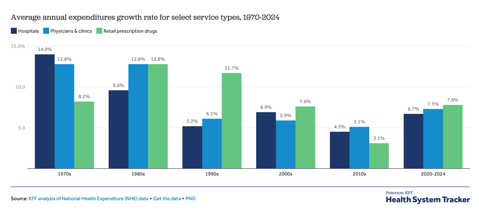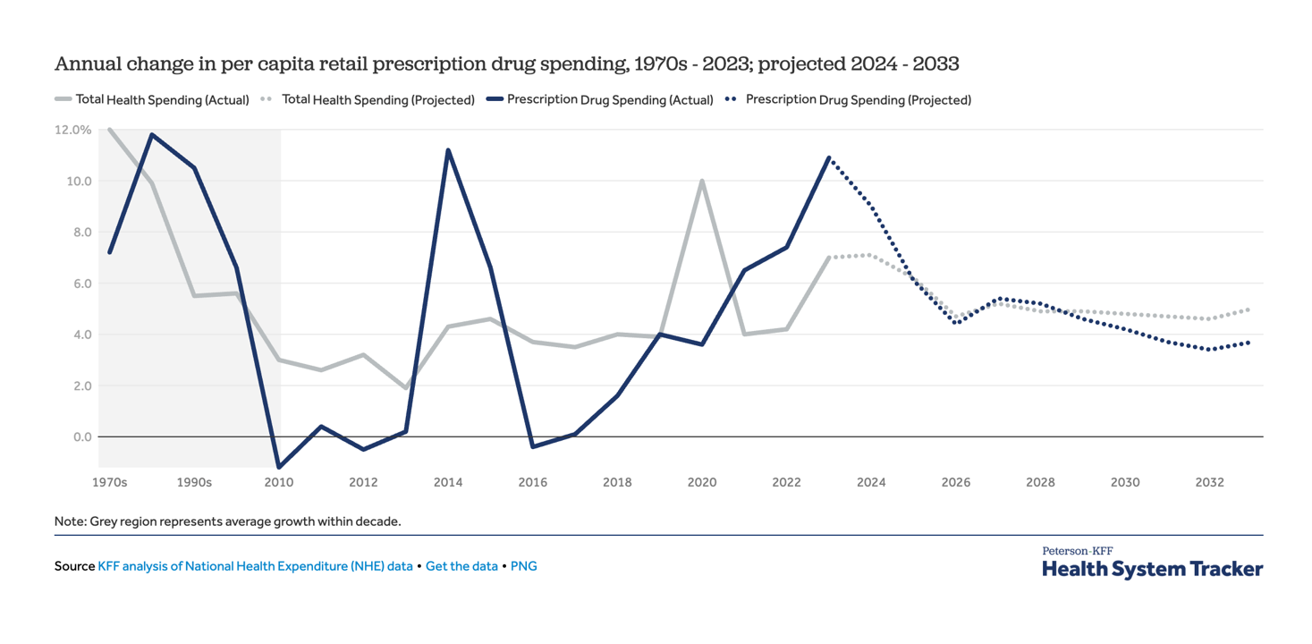 2020年至2024年,医院和医生/诊所的平均支出增长率分别为6.7%和7.3%,而零售处方药的平均支出增长率达到7.8%,此前2010年至2020年处方药支出的复合年增长率为3.1%。(见下图)