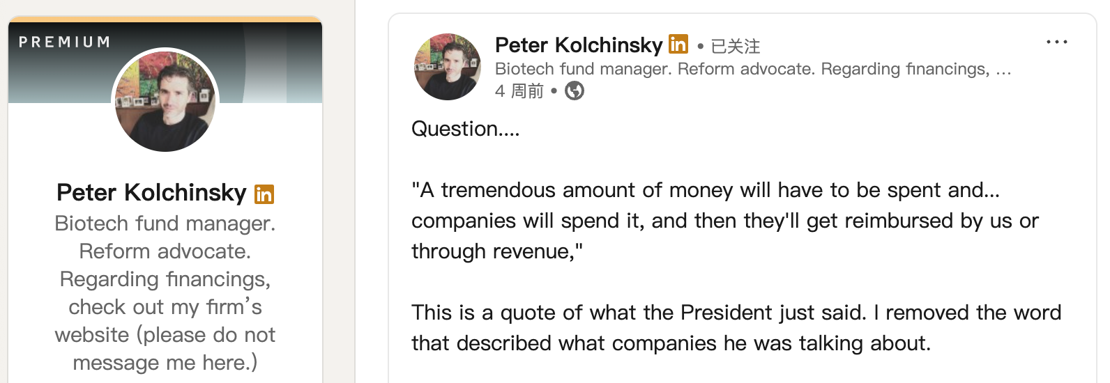 RA Capital管理合伙人Peter Kolchinsky在领英个人账户的评论中提到一个值得深思的现象:似乎许多人都明白,要让企业去做一件事,比如开发油田,就得让这件事具备经济可行性,让企业能获得投资回报。可一旦谈到研发能改善人类健康的创新药物,即便是素来思虑周全的人,第一反应也会是对创新药物实施价格管制,而非改革医保制度以降低民众的自付医疗费用。