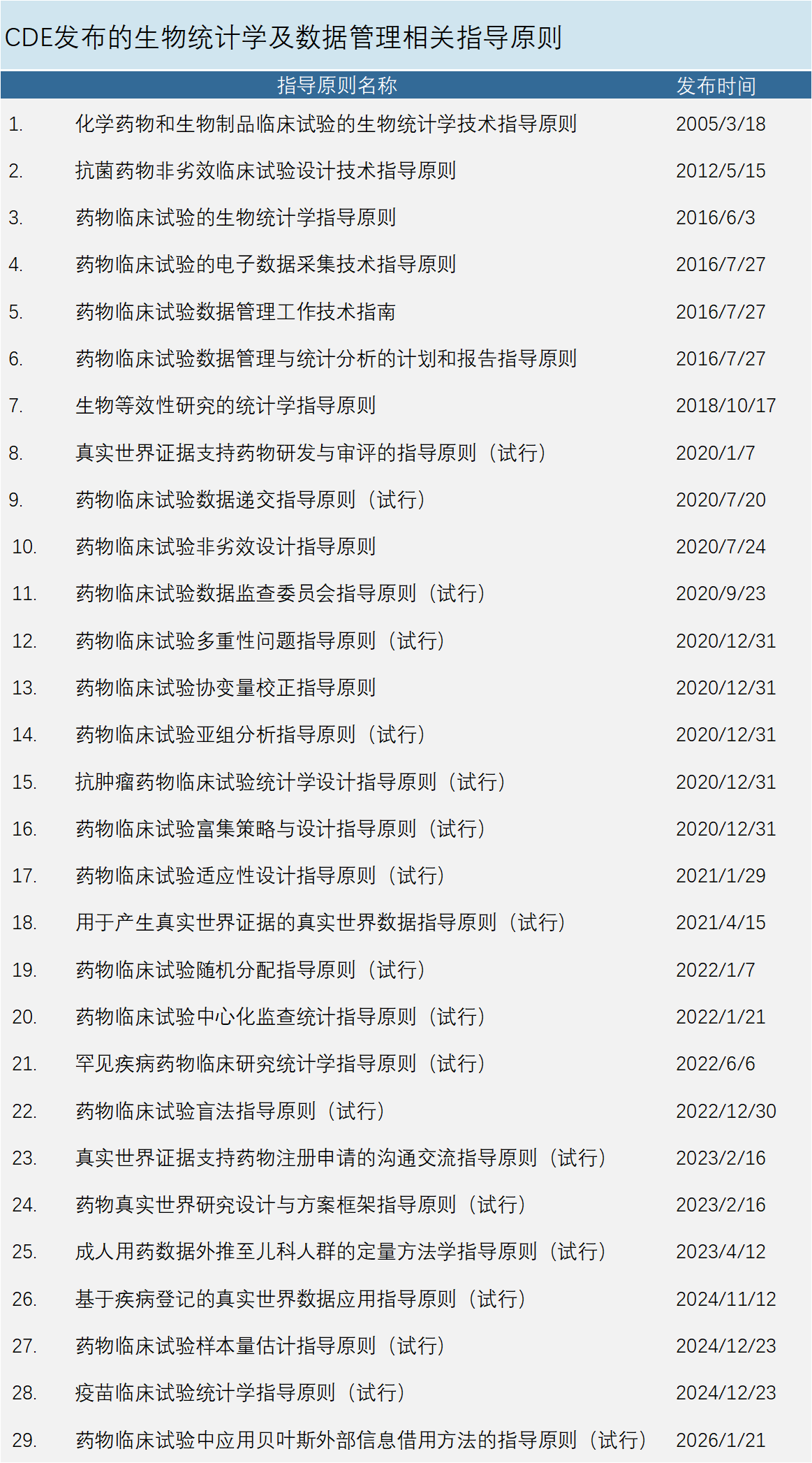 2019年,CDE牵头成立生物统计学三方协调委员会,由监管方、学术方和企业方代表组成。该委员会撰写和发布了一系列统计学相关指导原则,内容涵盖随机化、盲法、协变量校正、亚组分析、多重性校正、样本量估计等方面。为了进一步鼓励创新,又出台了适应性设计、富集设计、真实世界研究等系列指导原则,确保中国在新药研发前沿领域与国际保持同步。截至目前,共有29部统计学、数据管理相关指导原则颁布实施或试行(见下表)。
