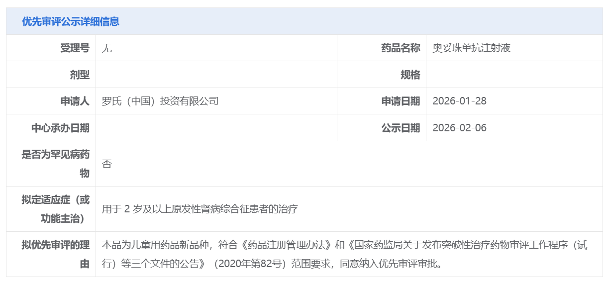 罗氏的奥妥珠单抗注射液获CDE拟纳入优先审评