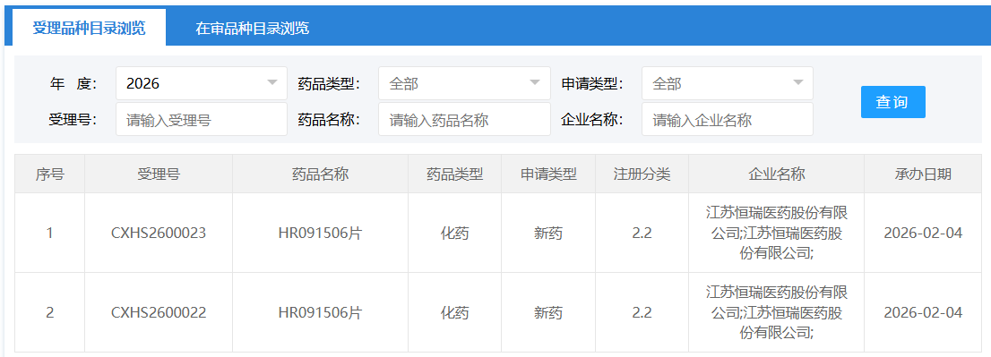 恒瑞医药2.2 类新药 HR091506 片的上市许可申请已获CDE 受理