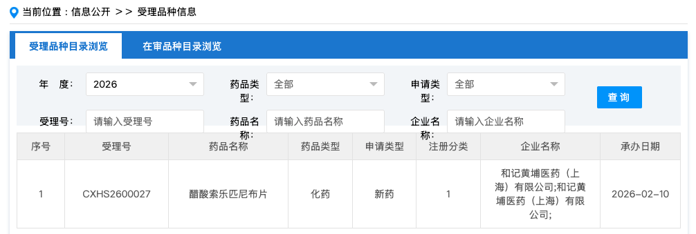 和黄医药的醋酸索乐匹尼布片上市申请获CDE受理
