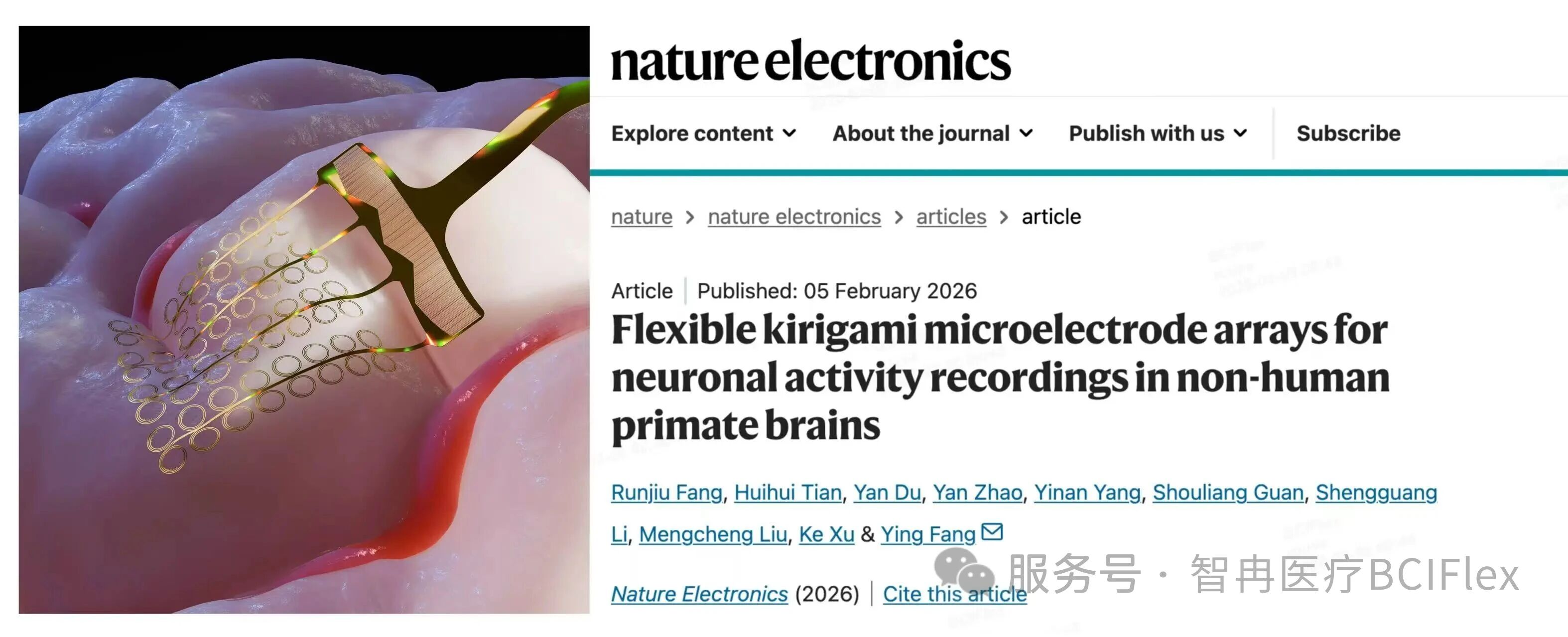 左:高通量可拉伸柔性电极 右:《自然・电子学》官网发布截图