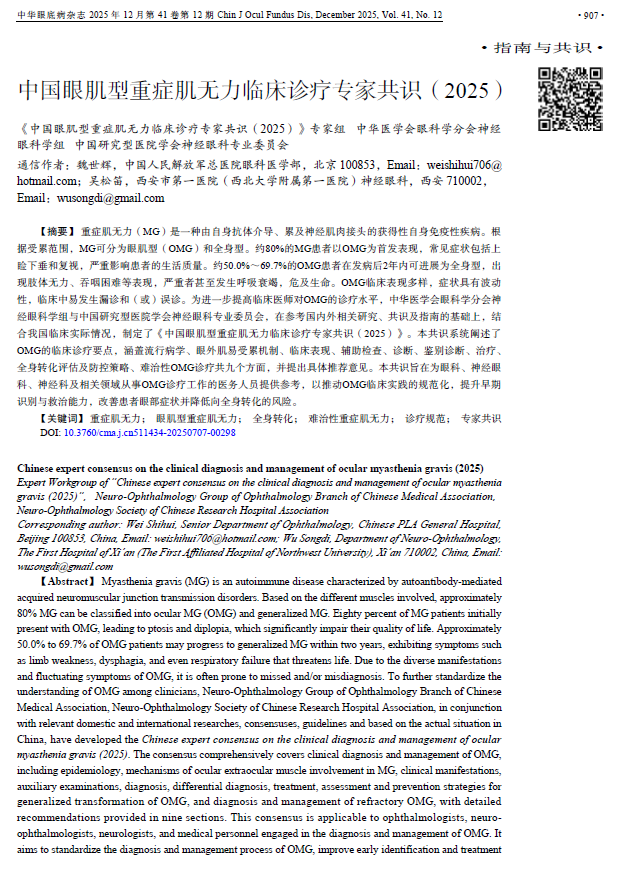 此外,2025年12月,艾加莫德已被纳入《中国眼肌型重症肌无力临床诊疗专家共识(2025)》。共识指出,初步研究表明,艾加莫德对常规治疗效果不佳或不耐受的oMG患者具有潜在疗效1。该共识由中华医学会眼科学分会神经眼科学组与中国研究型医院学会神经眼科专业委员会联合制定,为oMG的规范化诊疗提供了全新依据。