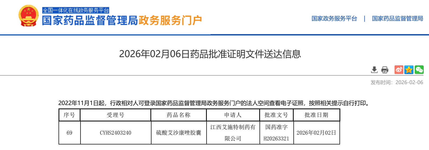 2026 年 3月 3日,济民可信集团宣布,公司自主研发的抗真菌药物硫酸艾沙康唑胶囊已获得国家药品监督管理局批准上市。这是国内第二家申报并获批上市的该品种仿制药,将为患者带来新的治疗选择和希望。