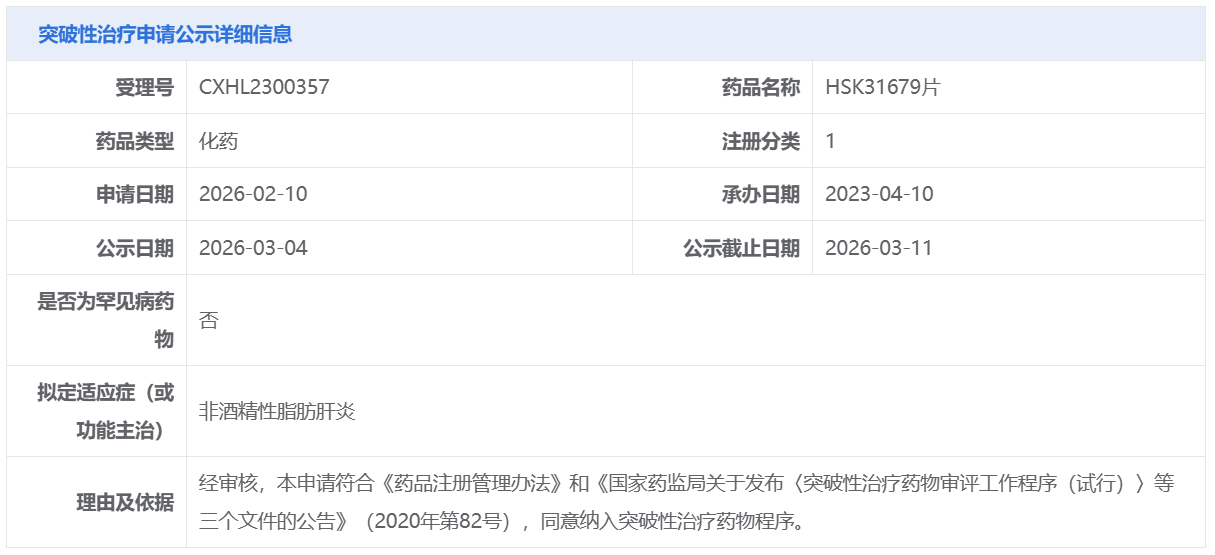 海思科医药的HSK31679片获CDE拟纳入突破性治疗品种