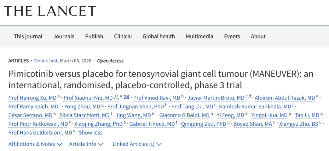 1.Xu H, Niu X, Ravi V, et al. Pimicotinib versus placebo for tenosynovial giant cell tumour (MANEUVER): an international, randomised, placebo-controlled, phase 3 trial. Lancet. Published online 2026.