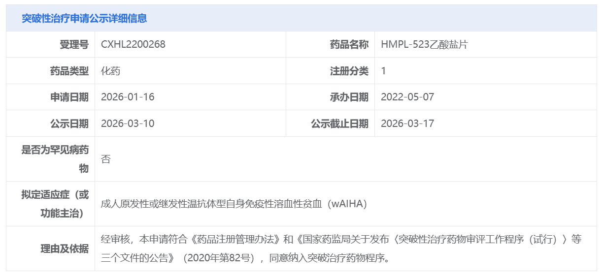 和记黄埔HMPL-523乙酸盐片获CDE拟纳入突破性治疗品种