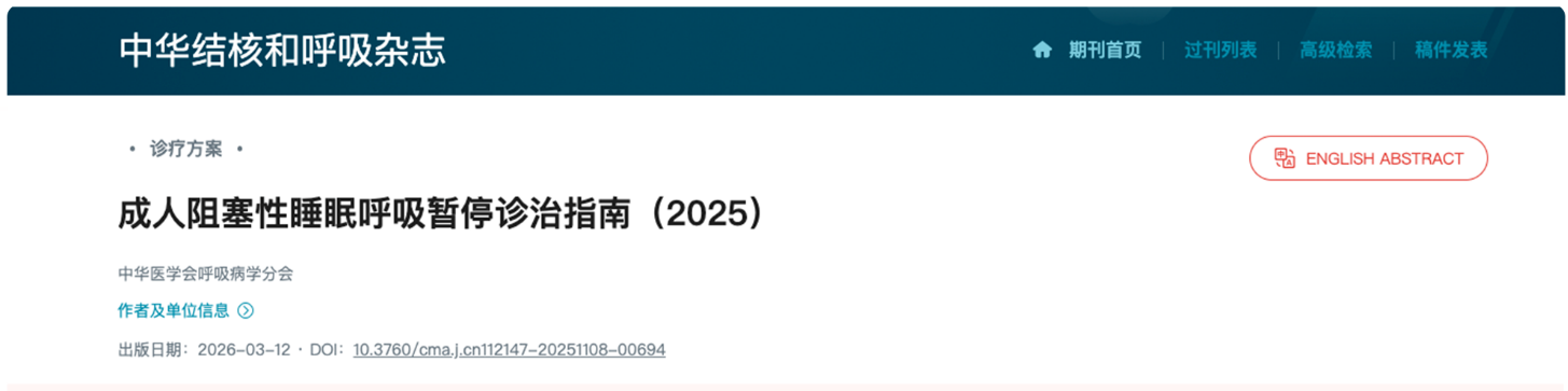 2026年3月13日《成人阻塞性睡眠呼吸暂停诊治指南(2025)》重磅发布,该指南由中华医学会呼吸病学分会制订、《中华结核和呼吸杂志》刊发。