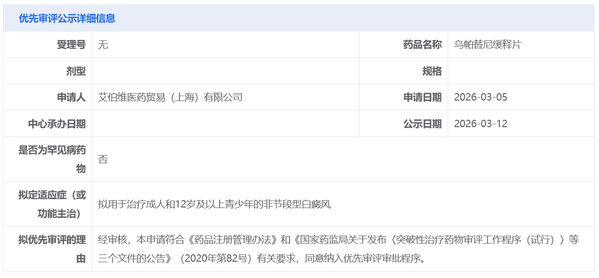 艾伯维的乌帕替尼缓释片获CDE拟纳入优先审评