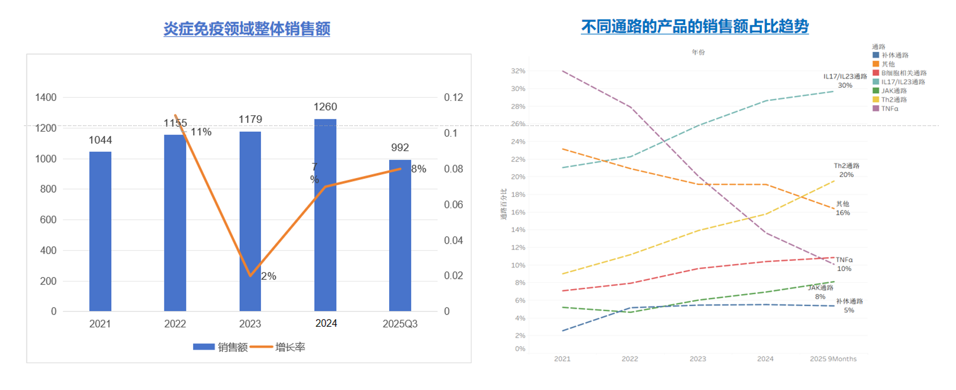 从整体规模看,炎症免疫已经成长为一个年销售额超过千亿美元的全球性大市场,并长期维持中高个位数的复合增长率。即便在2023年受阿达木单抗(Humira)专利悬崖影响,整体增速短暂回落,但随后IL-17/IL-23通路与Th2通路产品的快速放量迅速填补了市场空缺,使增长轨迹重回正轨。