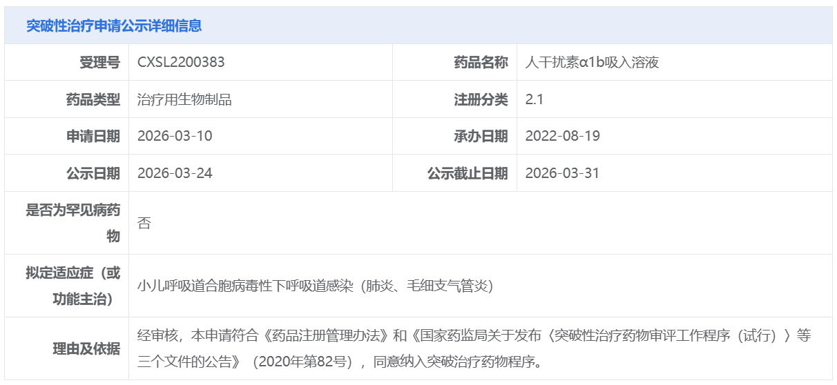 科兴药业的人干扰素α1b吸入溶液获CDE拟纳入突破性治疗品种
