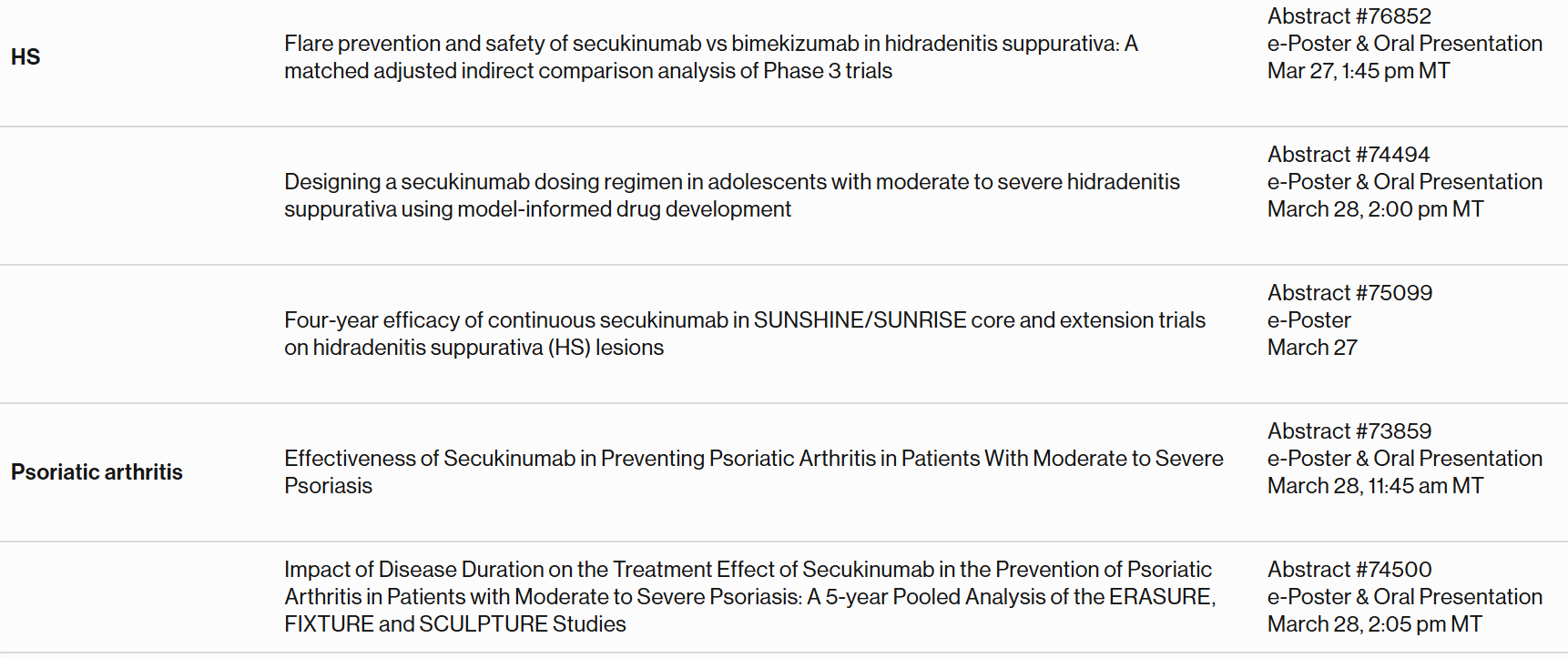 Presentations include new Rhapsido® (remibrutinib) data highlighting changes in daily itch and hives severity scores at week 1 in patients with chronic spontaneous urticaria (CSU), an indirect comparison on Cosentyx® (secukinumab) safety and flare prevention for patients with hidradenitis suppurativa (HS) vs. bimekizumab, as well as 4- and 5-year efficacy data from pivotal trials in HS and psoriasis, respectively.