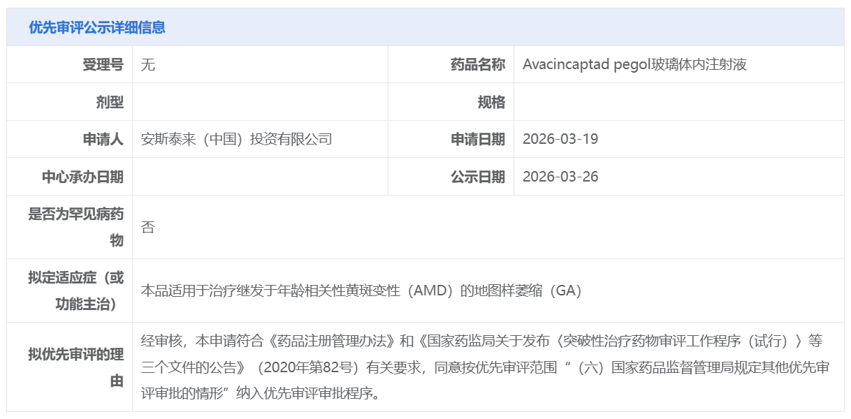 安斯泰来的Avacincaptad pegol玻璃体内注射液获CDE拟纳入优先审评