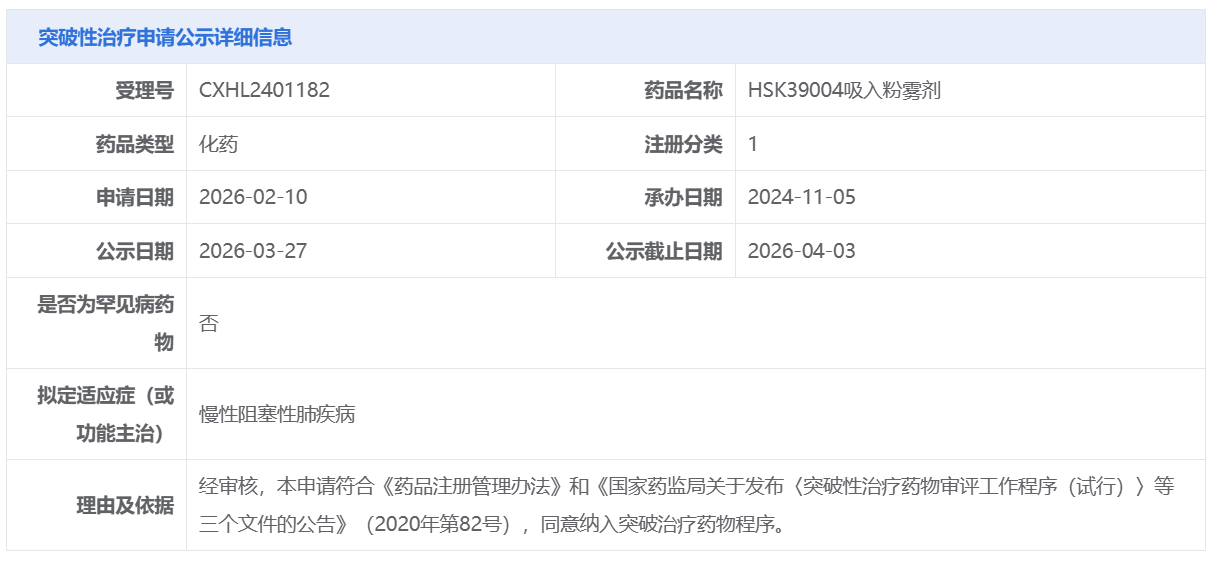 海思科的HSK39004吸入粉雾剂获CDE拟纳入突破性治疗品种