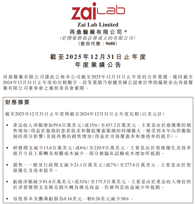 再鼎医药公布2025年全年业绩