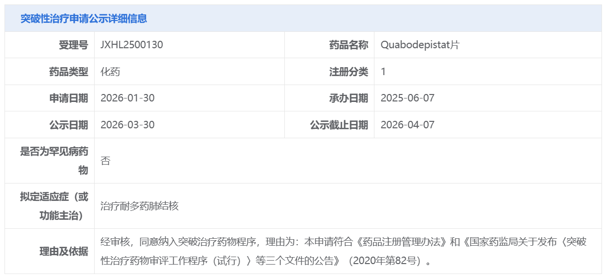 大冢制药的Quabodepistat片获CDE拟纳入突破性治疗品种