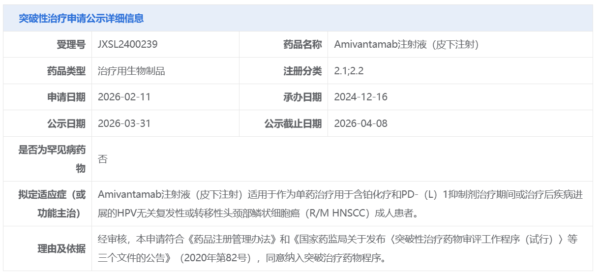 强生的Amivantamab注射液(皮下注射)获CDE拟纳入突破性治疗品种