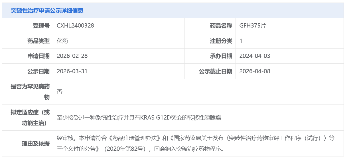 劲方医药的GFH375片获CDE拟纳入突破性治疗品种