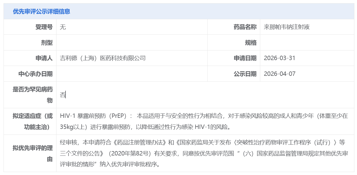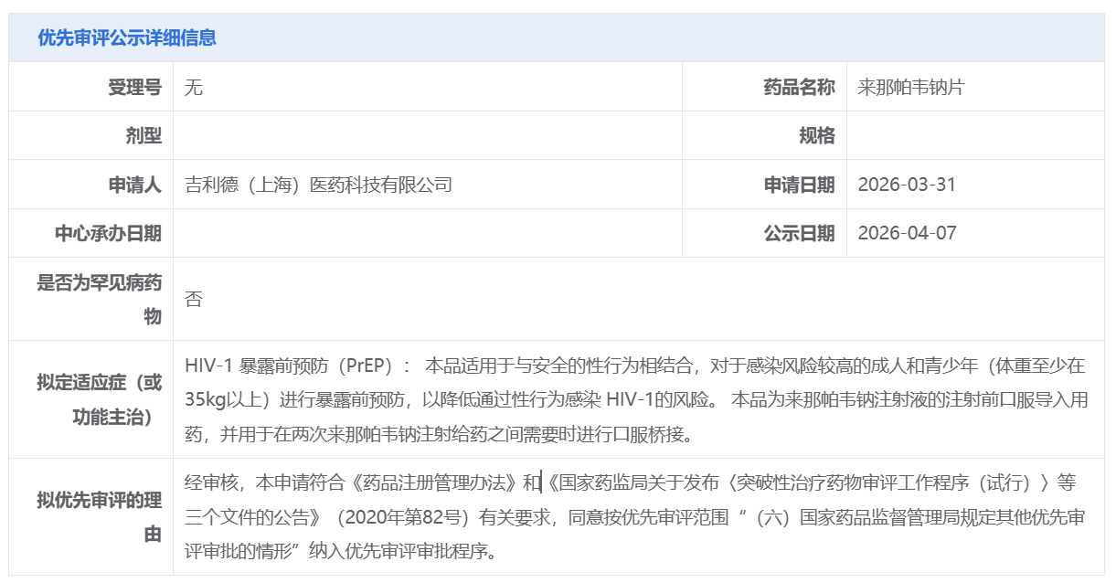 吉利德来那帕韦钠注射液和来那帕韦钠片获CDE拟纳入优先审评