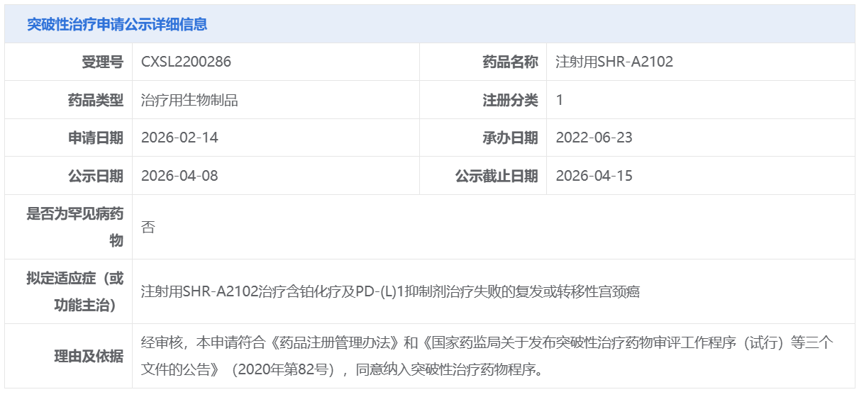 恒瑞医药的注射用SHR-A2102获CDE拟纳入突破性治疗品种