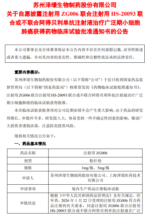 泽璟生物注射用 ZG006 联合注射用HS-20093联合或不联合阿得贝利单抗注射液治疗广泛期小细胞肺癌获NMPA临床试验批准