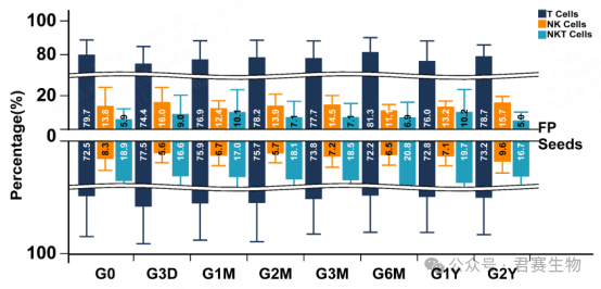 图2显示,经不同时长冻存后,TIL种子细胞及终产品中T/NK/NKT细胞亚群比例与对照组相比无显著差异(P>0.05)。