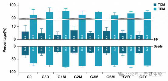 据图4,经不同时长冻存后,TIL种子细胞及终产品中中央记忆T细胞(TCM)与效应记忆T细胞(TEM)占比与对照组相比均无显著差异(P>0.05)。