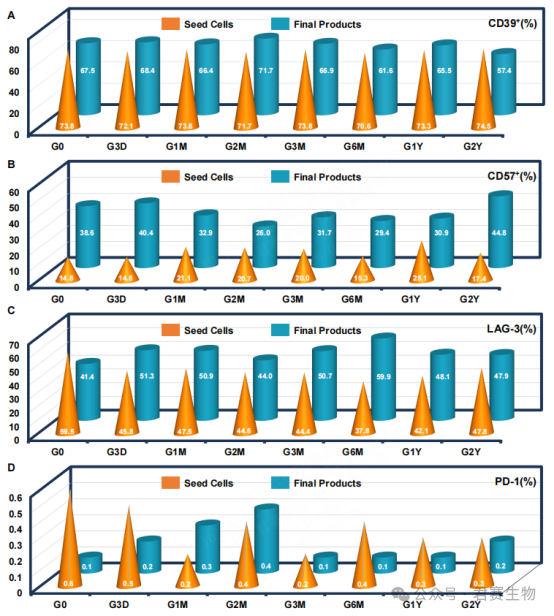 图5数据中看到,经不同时长冻存后,TIL种子细胞及终产品中T细胞CD57⁺、CD39⁺、LAG-3⁺、PD-1⁺等耗竭标志物表达水平与对照组相比均无显著差异(P>0.05)。