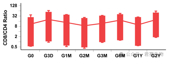 图6数据中,经不同时长冻存的TIL种子细胞复苏后扩增收获的终产品中,T细胞中 CD8⁺/CD4⁺比例与对照组相比均无显著差异(P>0.05),且该比值整体保持稳定。