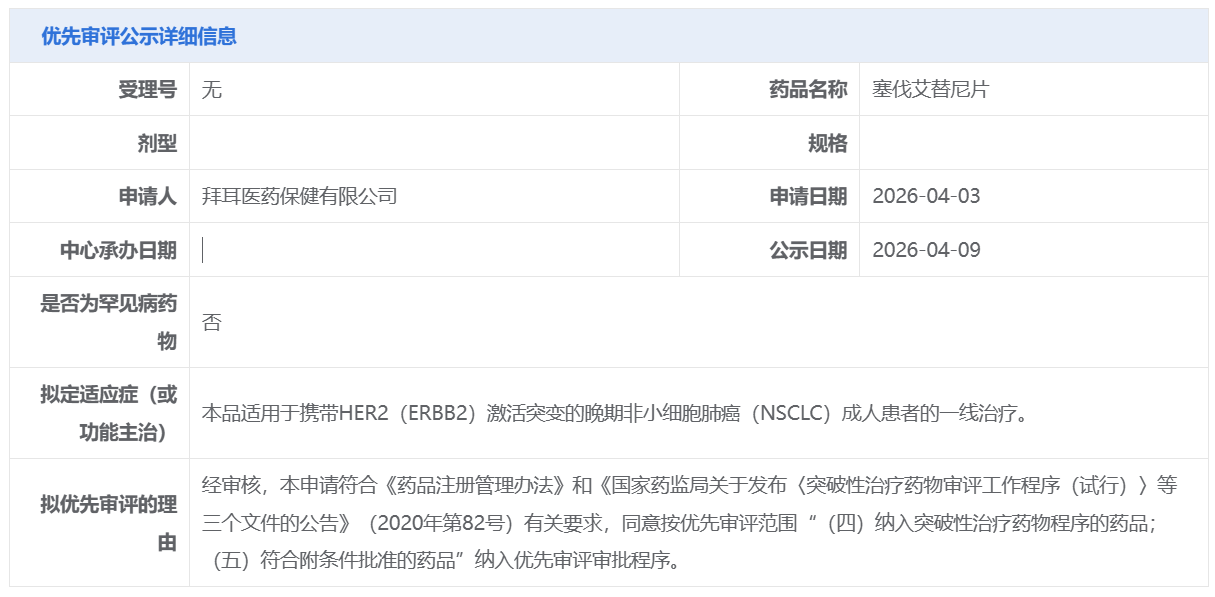 拜耳的塞伐艾替尼片获CDE拟纳入优先审评