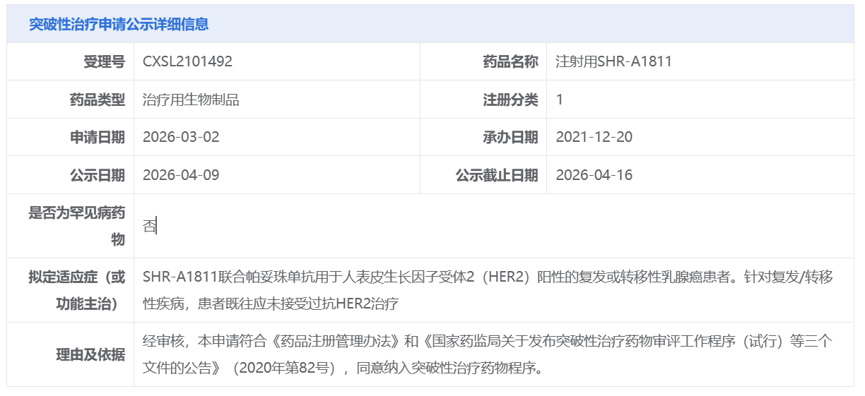 盛迪亚生物的注射用SHR-A1811获CDE拟纳入突破性治疗品种